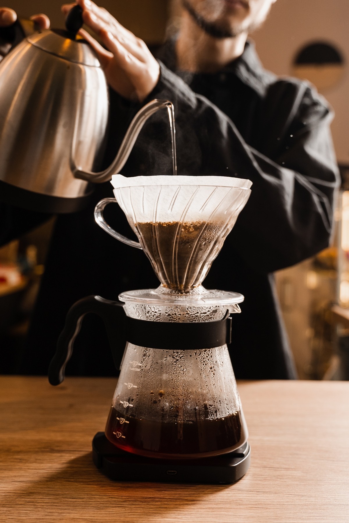 Przelewowy ekspres elektryczny pozwala uzyskać kawę o mniej wyraźnej kwasowości niż w przypadku parzenia przy użyciu V60. Prosty w obsłudze i łatwy w utrzymaniu.